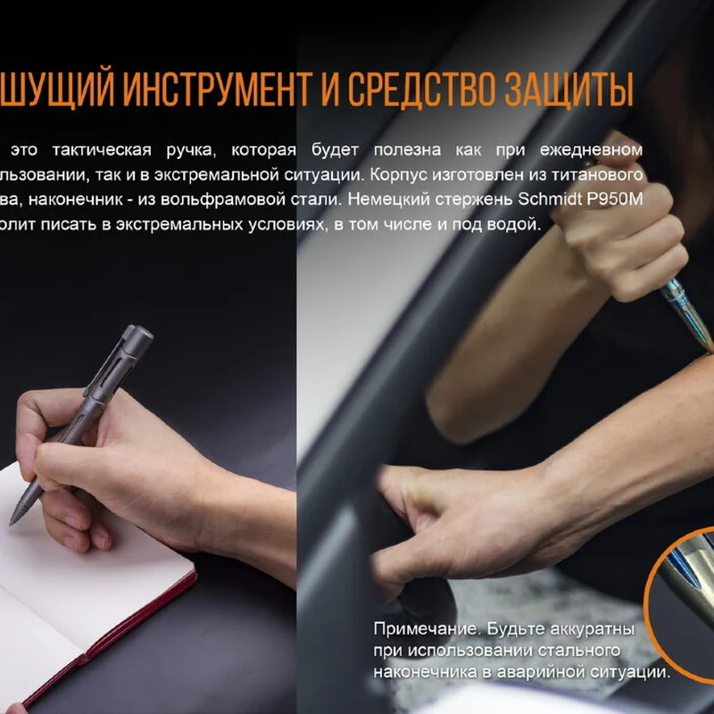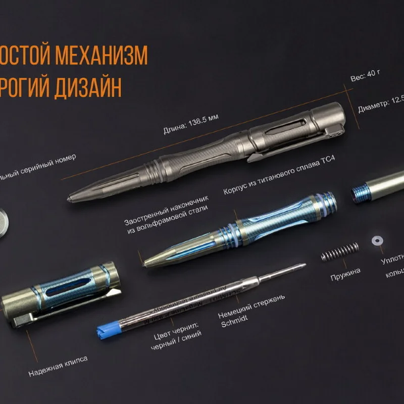 Пишучий стрижень кожної тактичної ручки T5Ti заправляється під тиском, а тому дуже добре пише. До речі кажучи, дана модель буде писати при температурах від -35°С до 120°С. Також можливе написання під водою. Робочий потенціал одного фірмового стрижня-5500-6000 метрів.