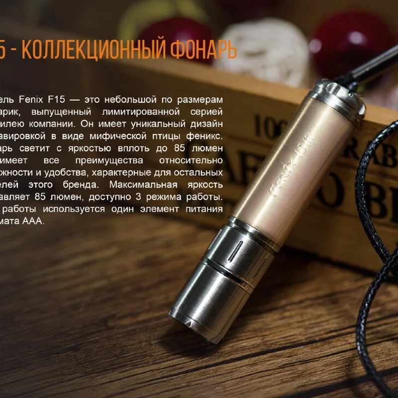Ліхтар F15 був розроблений і випущений до 15-річного ювілею компанії Fenix. Ця серія є лімітованою і відрізняється унікальним дизайном. Частина корпусу ліхтаря має колір рожевого золота з рельєфним зображенням птиці фенікс. F15 - зовсім невеликий ліхтар і його можна носити в якості брелока зі зв'язкою ключ. Незважаючи на це, дана модель підтримує роботу в трьох різних режим. Найяскравіший з них називається High і пропонує 85 люмен світла. Цей достатньо, щоб радіус освітлюваної території становив 45 метрів. У режимі середньої яскравості ліхтар світить на 25 люмен, висвітлюючи територію В радіусі 18 метр. У третьому, найекономнішому, режимі ліхтар має яскравість 8 люмен і світить на 8 метрів вдалину.