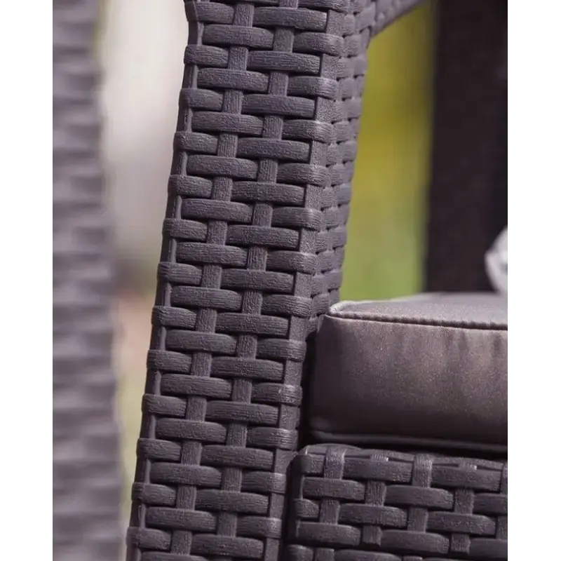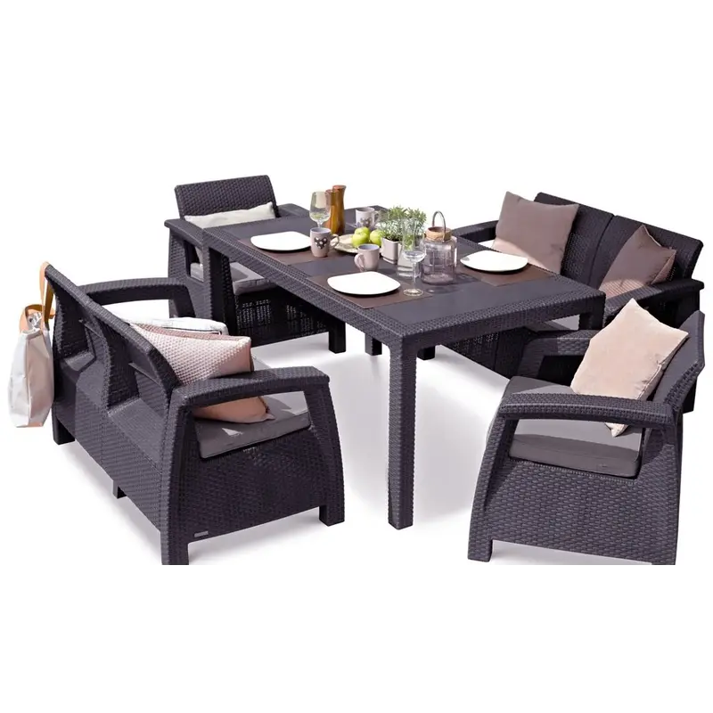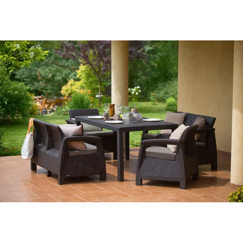 Набір садових меблів Keter Corfu Fiesta — це стильне й просторе рішення для облаштування зони відпочинку на дачі, терасі або в саду. Комплект розрахований на шість осіб і включає два дивани, два крісла та прямокутний стіл. Завдяки імітації плетіння ротанга та насиченому графітовому кольору меблі виглядають сучасно й естетично. Усі елементи виготовлені з міцного поліпропілену, стійкого до вологи, УФ-випромінювання та механічних пошкоджень. Подушки із сірими знімними чохлами забезпечують додатковий комфорт. Комплект легко збирається, не потребує складного догляду й чудово зберігає зовнішній вигляд при використанні просто неба.Особливості Виготовлений із міцного поліпропілену з текстурою під ротанг, стійкого до атмосферних впливів, ультрафіолету та вологи; Зручні крісла та дивани мають ергономічну форму й комплектуються м’якими подушками зі знімними чохлами; Прямокутний стіл із великою поверхнею 161×95 см ідеально підходить для обідів, напоїв і настільних ігор на свіжому повітрі; Усі елементи комплекту не піддаються корозії, не іржавіють і не гниють завдяки повністю пластиковому корпусу; Легка збірка без інструментів — меблі збираються вручну за простою інструкцією; Максимальне навантаження на кожне крісло становить 110 кг, що забезпечує міцність і надійність під час експлуатації.Варіанти використання Набір пластикових меблів оптимальний для сімейних обідів на дачі або в саду завдяки великому столу та зручним місцям для сидіння; Чудове рішення для прийому гостей на терасі, в зоні барбекю або біля басейну; Підходить для оформлення літніх кафе, готелів, пансіонатів і лаунж-зон із великою прохідністю; Може використовуватись як стаціонарний комплект для організації обідньої зони під навісом або тентом; Зручний для сезонного використання та легко складається на зберігання в холодну пору року завдяки модульній конструкції.*Реальний колір товару може дещо відрізнятися від зразків, представлених на сайті, залежно від технічних налаштувань вашого екрану, а також, зважаючи на особливості матеріалу, відтінок може змінюватися залежно від освітлення.