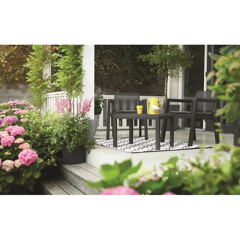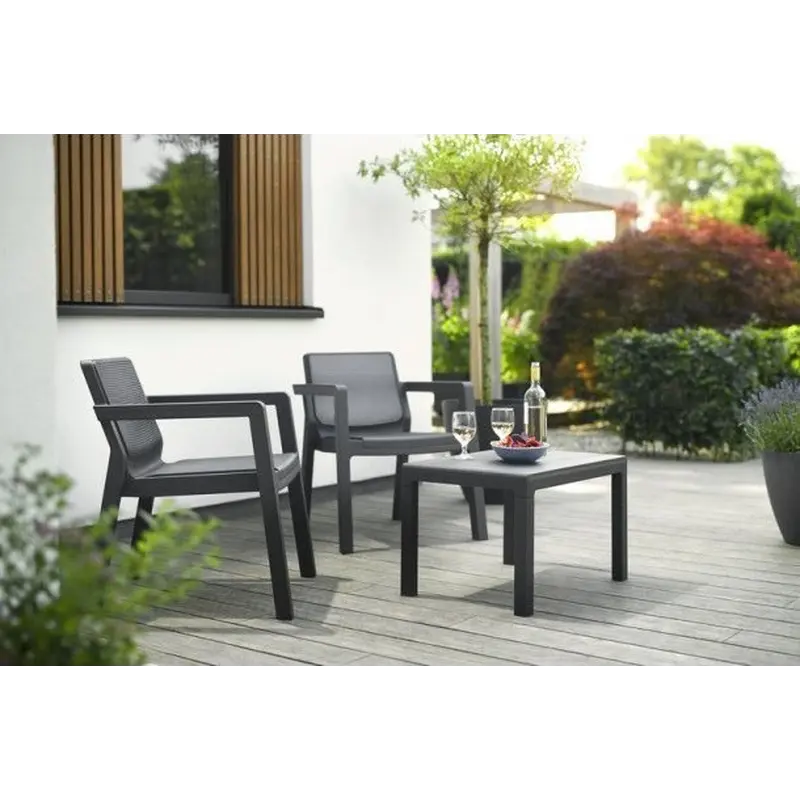 Міцний та зручний Набір меблів Keter Emily Balcony set з подушками у стильному кольорі графіт призначений для облаштування будь-якого відкритого простору — саду, тераси, зони барбекю, веранди, заходів на свіжому повітрі та багато іншого. Також завдячуючи своїм невеликим розмірам, комплект може бути використаний у якості меблів для балкона або кафе. До складу набору входять 2 комфортні крісла, укомплектовані подушками, та кавовий столик.