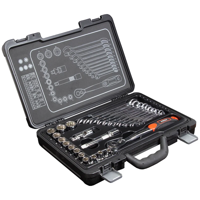 Надійний кейс з удароміцного пластику дозволяє систематизувати зберігання інструменту та забезпечує легкість у пошуку потрібного предмета. Кейс має посилені петлі, захисні накладки на кутах та металеві замки, які добре фіксуються та запобігають мимовільне відкриття кейса. Весь інструмент міцно фіксується в посадкових місцях, не висипаючись при транспортуванні.