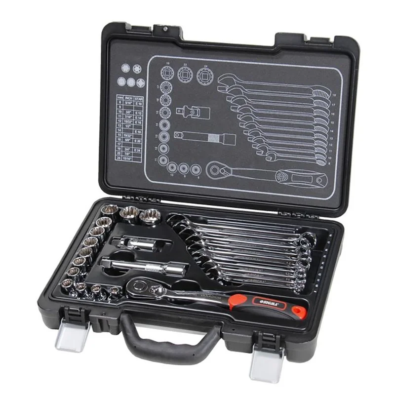 Усі елементи виготовлені з високоякісної хромованадієвої сталі CrV 50BV30. Відмінною рисою даної марки сталі є велика кількість легуючих добавок, завдяки чому матеріал стає менш схильним до крихкого руйнування та збільшує надійність при експлуатації. Тришарове хромонікелеве покриття збільшує термін служби інструменту та запобігає корозії. Комплект містить оптимальний набір пристосувань для виконання різних видів робіт у майстерні, на автосервісі, гаражі або СТО, а також для різноманітних побутових потреб.
