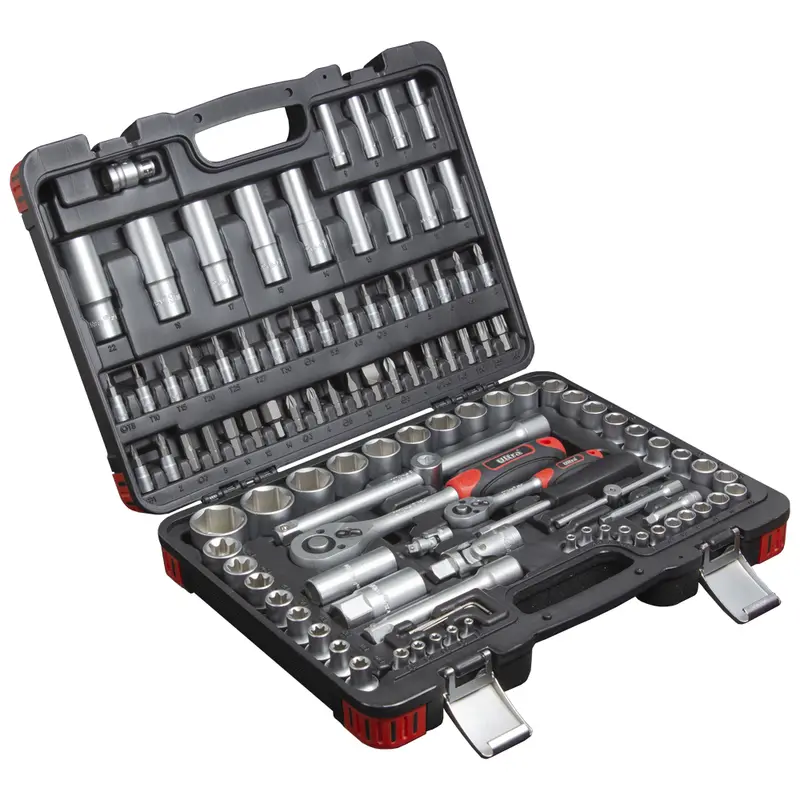 Надійний кейс з удароміцного пластику дозволяє систематизувати зберігання інструменту та забезпечує легкість у пошуку потрібного предмета. Кейс має посилені петлі, захисні накладки на кутах та металеві замки, які добре фіксуються та запобігають мимовільне відкриття кейса. Весь інструмент міцно фіксується в посадкових місцях, не висипаючись при транспортуванні.