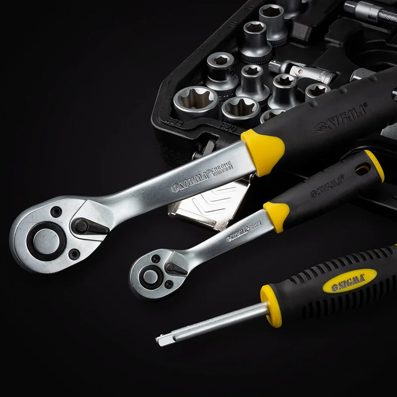 Набір комплектується тріскачками з квадратом 1/2" і 1/4" оснащеними флажковим механізмом для перемикання напрямку роботи та кнопкою швидкого скидання. Механізм тріскачки виконаний з хроммолібденової сталі 42CrMo на виробничих потужностях на острові Тайвань. 72-зубцовий механізм дозволяє виконувати роботи в обмеженому просторі з кутом повороту в 5°.