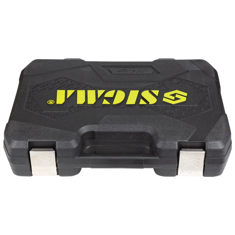 Для зручного зберігання та транспортування, набір поставляється в кейсі виконаного з міцного ABC-пластика. Кейс має посилені петлі та металеві замками, які добре фіксуються та запобігають мимовільне відкриття кейса. Весь інструмент міцно фіксується в посадкових місцях, не висипаючись при транспортуванні. Невеликі габаритні розміри набору дозволяють компактно розмістити його в багажному відділенні вашого автомобіля або в гаражі.