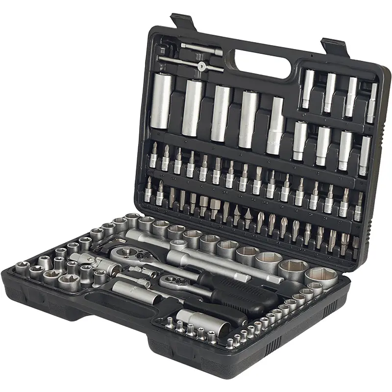 Набір (108 од.) насадок торцевих з тріскачками застосовується для роботи з різьбовими з'єднаннями Склад набору: 1/2" — тріскачка з реверсом на (24 зубці); вороток 250 мм, голівки: 10-22, 24, 27, 30, 32 мм; голівки E-тип: 10-14, 16, 18, 20, 24; голівкиподовжені: 14, 15, 17, 19, 22 мм; подовжувачі 125 та 250 мм; карданний шарнір; голівки свічні 16 та 21 мм; утримувач біт 5/16"; біти SL (8, 10, 12), PH (3, 4), PZ (3, 4), T (40, 45, 50, 55, 60), H (7, 8, 10, 12, 14); 1/4" — тріскачка з реверсом (24 зубці); голівки: 4-14 мм; голівки E-тип: 4-8; голівки подовжені: 6-13 мм; подовжувачі 50 та 100 мм; руків'я ви- крутки; вороток 110 мм;карданний шар- нір; гнучкий подовжувач 150 мм; шести- гранні ключі (1.5, 2, 2.5); адаптер квадрат-шестигранник; біти SL (4, 5.5, 7), PH (1, 2), PZ (1, 2), T (8, 10, 15, 20, 25, 27, 30), H (3, 4, 5, 6)