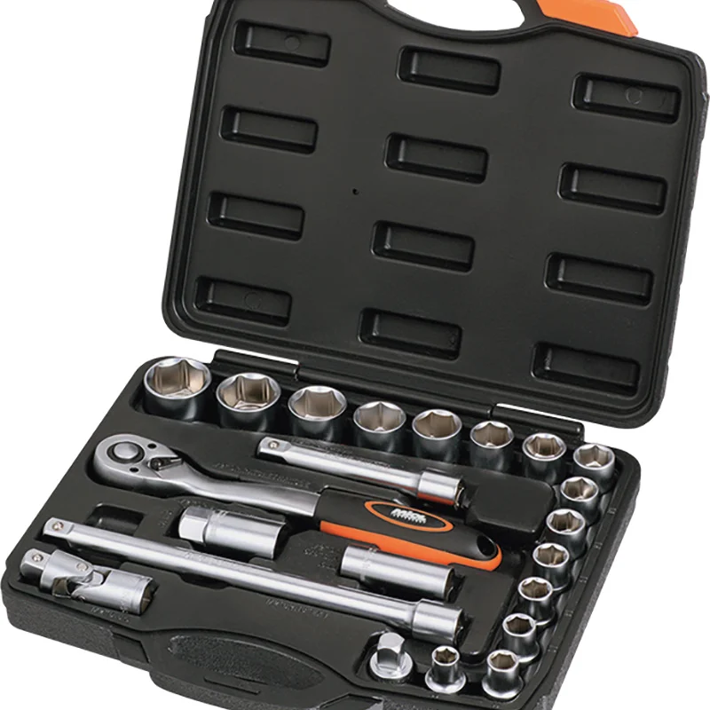 Набір насадок торцевих з тріскачками застосовується для професійної роботи з різьбовими з'єднаннями (22 од.) Хром-ванадій. Склад набору: 1/2" шестигранні головки торцеві 10-19, 22, 24, 27, 30, 32 мм; 1/2" карданний шарнір; 1/2" свічкові ключі 16 1/1/4 і 21 мм; 1/2" подовжувачі 125 і 250 мм; 1/2" тріскачка з двокомпонентною ручкою (72 зубця)
