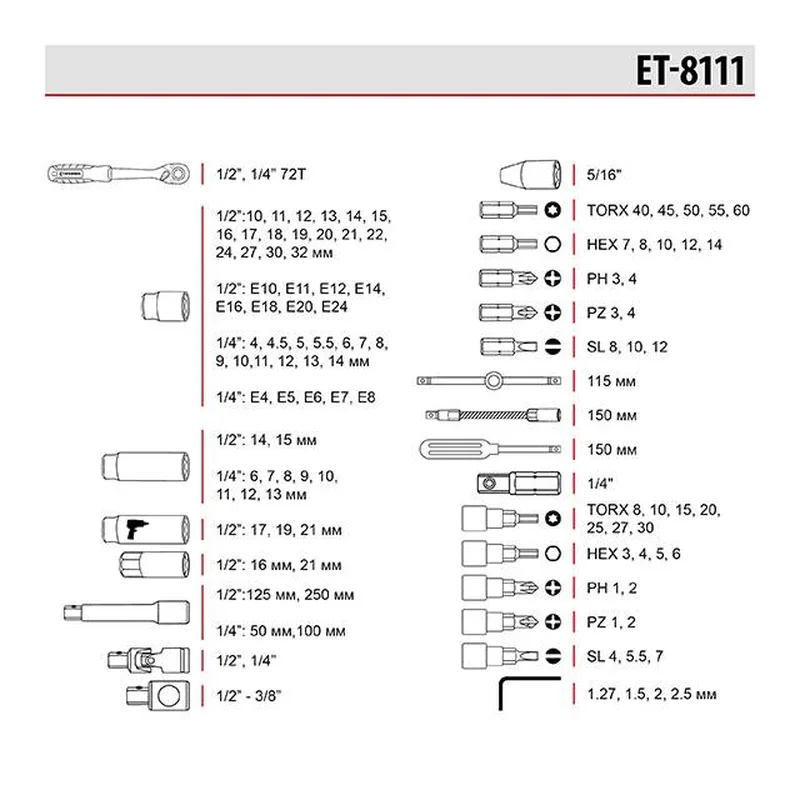 Набір інструментів 1/2 "& 1/4" 111 од., Cr-V STORM INTERTOOL ET-8111