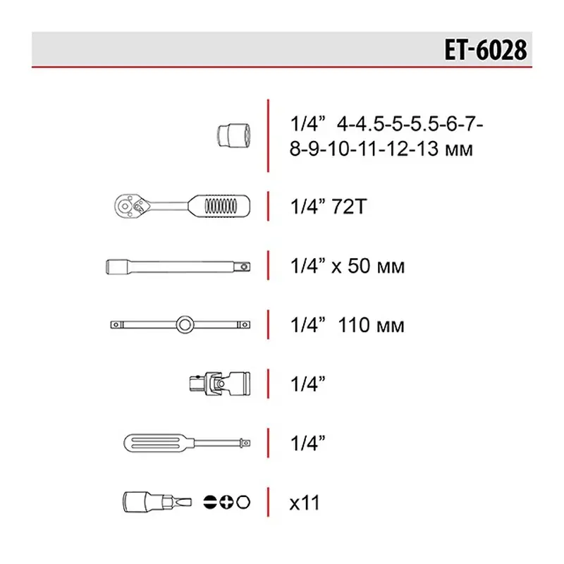 Набір інструментів 1/4", 28 од. (гол. 4-13 мм, біти 11 од.) INTERTOOL ET-6028