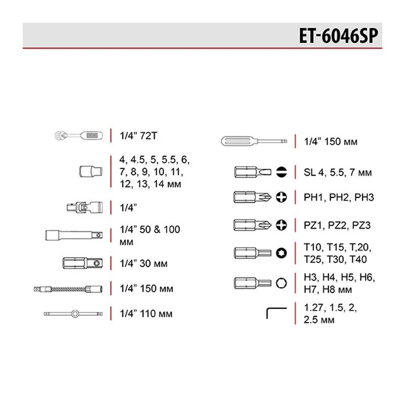 Комплектація набору з приводом 1/4” знадобиться для виконання переважної більшості робіт, пов'язаних з ремонтом обладнання, авто-, мото-, велотехніки, а також інших робіт у побуті та в гаражі домашнього майстра.