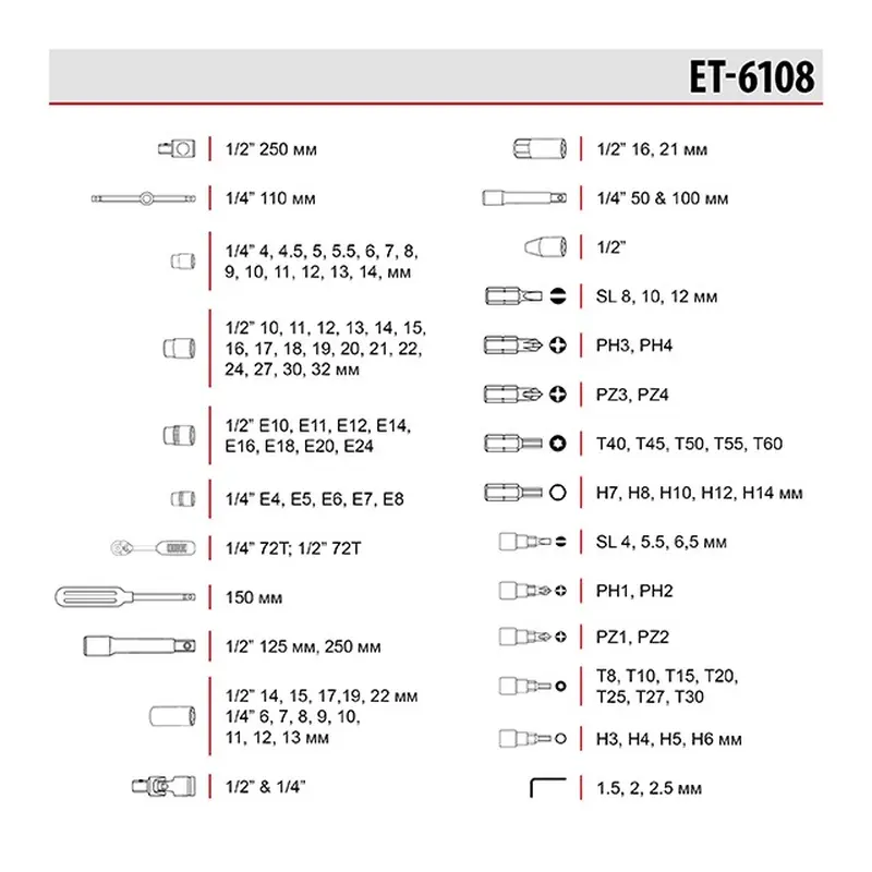 Набір інструментів Cr-V 1/2", 1/4", 108 од. INTERTOOL ET-6108