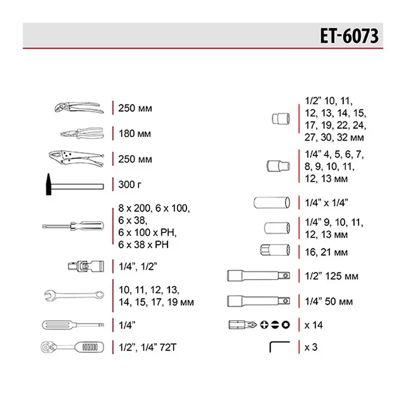 Головна особливість набору в його комплектації. Основою комплекту є дві тріскачки з приводом 1/2" та 1/4", шестигранні головки для виконання різнопланових робіт на закручування та відкручування кріплень. Наявність подовжувачів та кардана полегшать роботу у важкодоступних місцях.