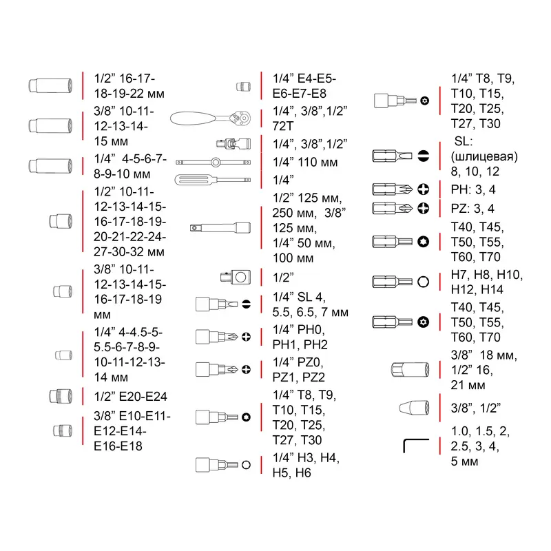 У наборі зібрані всі необхідні інструменти для комфортної роботи з вузлами автомобіля. Подовжувачі, кардани та Г-подібні шестигранні ключі дозволяють дістатися важкодоступних місць. З таким вибором біт та головок з насадками (SL, PZ, PH, TORX, HEX, TT) ви впораєтесь майже з будь-яким типом кріплення!
