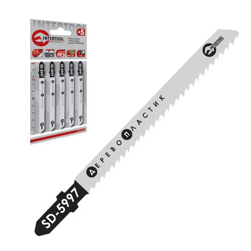Набір полотен 5 од. для лобзика. Робоча довжина 75 мм, відстань між зубцями 2,5 мм, для роботи по деревині, ламінату, пластику. INTERTOOL SD-5997