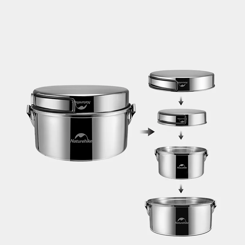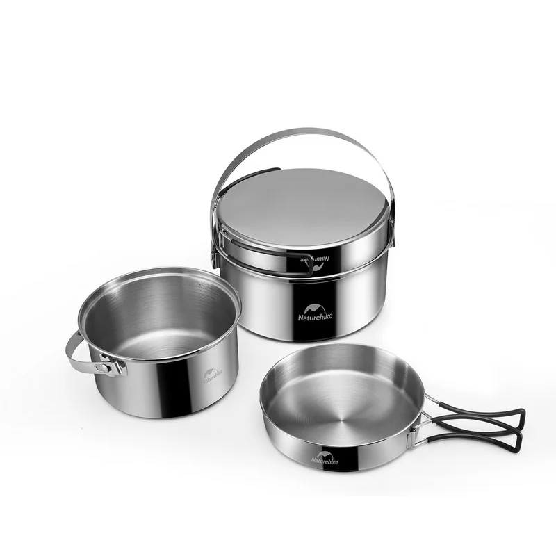 Набір посуду для походу Naturehike удосконалений з розрахунку на 2-3 чоловік включає 2 каструлі та 2 кришки до них, мочалку та пакувальний сітчастий чохол. Каструлі укладаються одна в одну за принципом матрьошки, заощаджуючи корисний обсяг Вашого спорядження, а також їх можна використовувати як тарілки. Дозволяє приготувати більші обсяги їжі. Всі вироби виготовлені з якісної нержавіючої сталі, що дозволяє уникнути пригоряння їжі, легко миються.