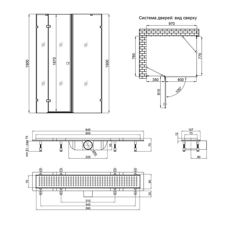Набір Qtap душова кабіна Capricorn CRM1018RC6 100х80, скло Clear 6 мм + трап лінійний Dry FB304-600 з сухим закривом та нержавіючою решіткою 600х73 мм