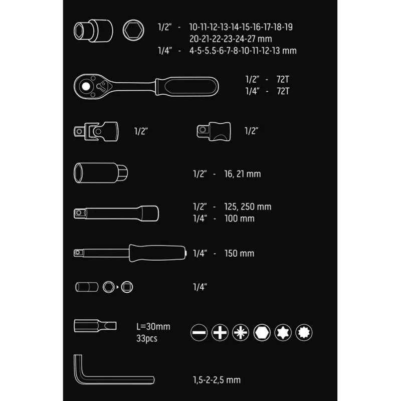 рукоятка викрутки (1 шт.), шестигранні ключі (3 шт.), ключі з тріскачкою (2 шт.), торцеві головки (28 шт.), наконечники викрутки в наборі PH0, PH1, PH2, PH3, SL4, SL5.5, SL7, шарнір у наборі (2 шт.), перехідник у наборі, подовжувач у наборі (3 шт.)
