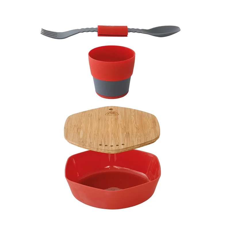 Robens Leaf Meal Kit Fire Red (690276) - зручний багатофункціональний набір туристичного посуду. Він складається з глибокої миски, кришки/обробної дошки, чашки, ложки та виделки. Набір збирається сам у себе і фіксується еластичною стрічкою.