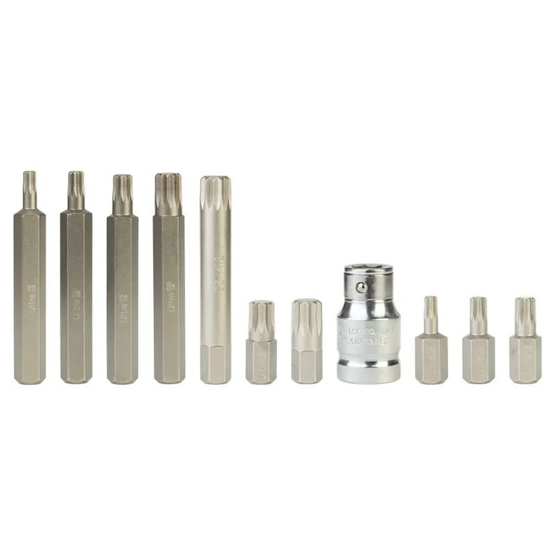 Набір біт Spline 10мм 11шт S2 (метал кейс) ULTRA (4016992) призначені для професійного використання. Виготовлені з легованої інструментальної сталі S2 з поверхневим зміцненням до твердості 58-61 HRC струмами високої частоти (СВЧ). Мають проточенну головну частину для роботи у вузьких місцях.
