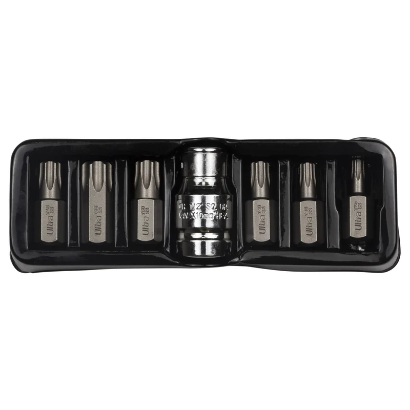 Набір біт TORX 10мм 7шт S2 (пласт кейс) ULTRA (4016902) призначені для професійного використання. Виготовлені з легованої інструментальної сталі S2 з поверхневим зміцненням до твердості 58-61 HRC струмами високої частоти (СВЧ). Мають проточенну головну частину для роботи у вузьких місцях.
