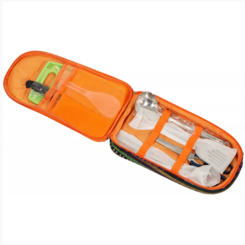Перше, що кидається в очі – це яскравий дизайн чохла з етно орнаментом. Всередині ви знайдете повноцінний набір для приготування супів, для смаження м'яса, нарізки овочів і тд. Кожен предмет набору розміщений в індивідуальному відсіку. Комплект Chief's Vocation стане хорошим помічником на риболовлі, на пікніку або навіть вдома.