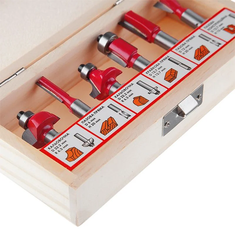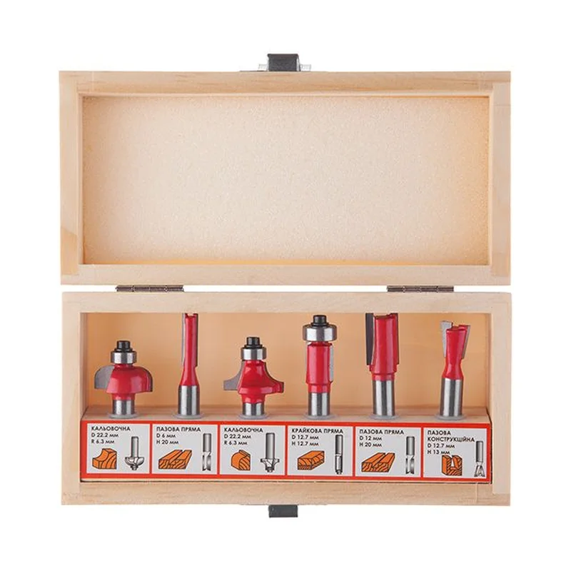 Даний набір містить 6 різних за формою фрез. Комплект універсальний тим, що в ньому підібрані фрези основних розмірів та типів, що дозволяє виконувати основні завдання з фрезерування.