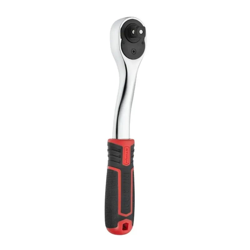 Основою комплекту є тріскачка з посадковим квадратом 1/2”, з перемикачем напрямку та кнопкою для скидання-фіксації головок. Її вигнута форма дозволяє працювати з незручно розташованими кріпленнями.