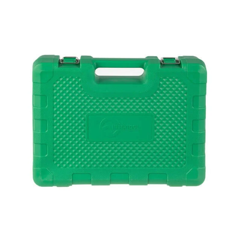Кейс набору з шарнірними петлями та щільними замками. Інструменти закріплені у своїх посадкових місцях - нічого не розсипається під час роботи або ходьби. Компактний, набір легко розміститься в багажнику або на стелажі.