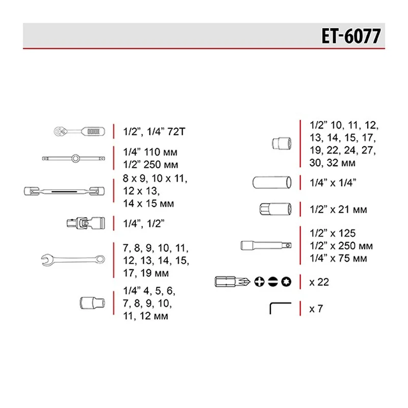 Набір включає 77 елементів для вирішення будь-якого завдання на відкручування, закручування кріплень. Для різних видів та діаметрів кріплень є цілий арсенал шестигранних торцевих головок від 4 до 32 мм.