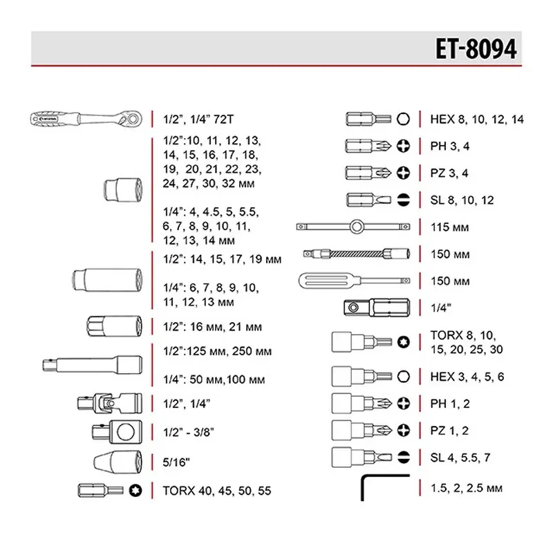 Набір інструментів 1/2" & 1/4", 94 од., Cr-V STORM INTERTOOL ET-8094