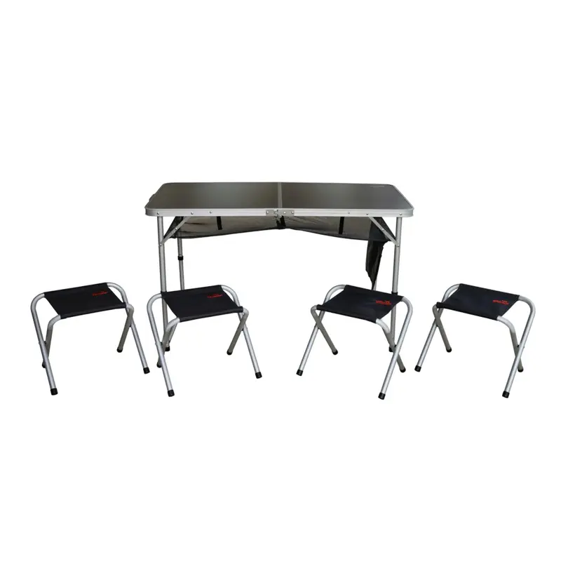 Стільці кріпляться до внутрішньої сторони столу, стіл складається навпіл як валізка.