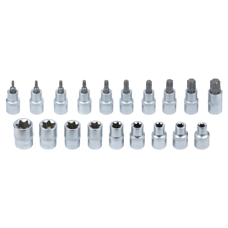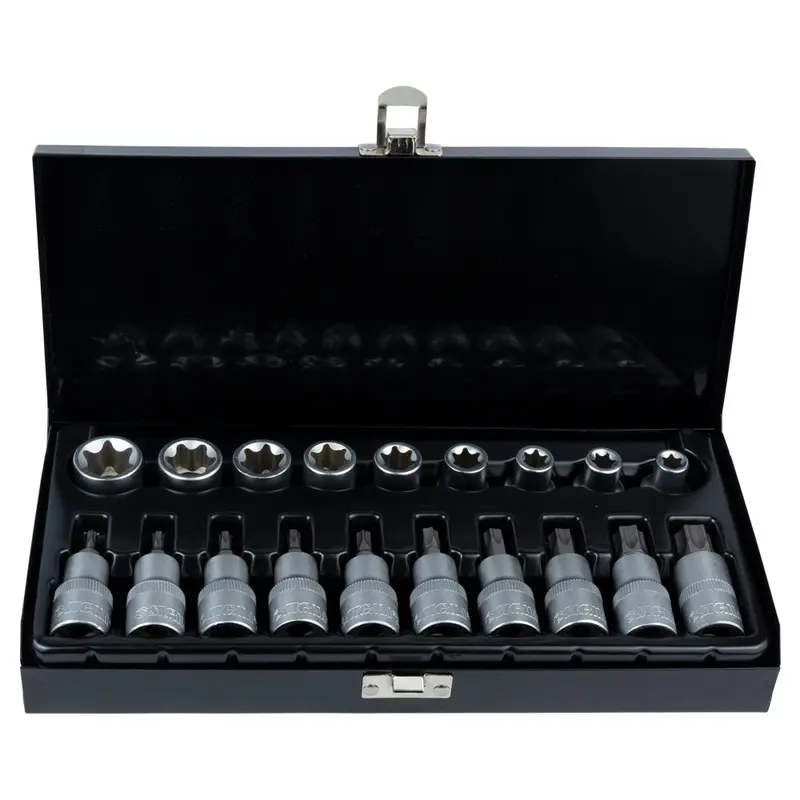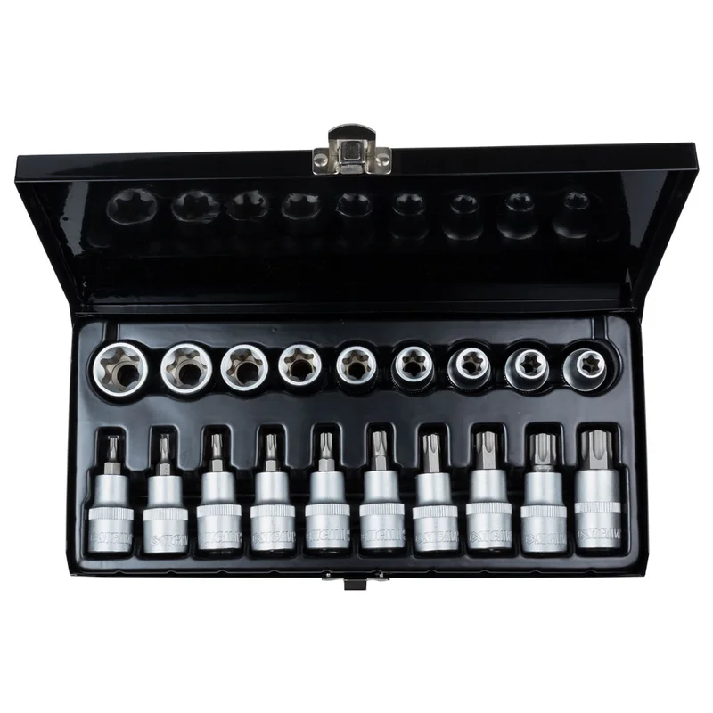 Набір насадок та біти з насадками Torx 1/2" 19шт CrV (метал. кейс) SIGMA (6086661) призначений для роботи з різьбовими з’єднаннями при ремонті і обслуговуванні автомобілів та інших механізмів, що мають зовнішній профіль у формі зірки Torx.