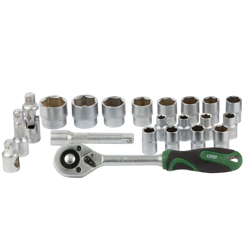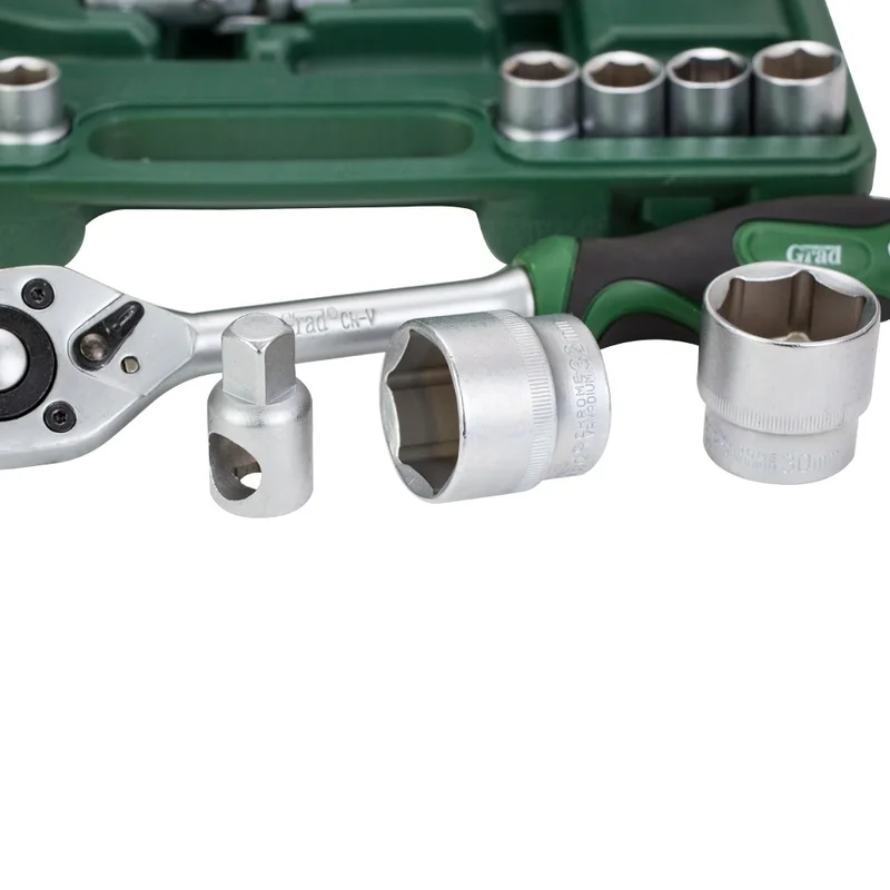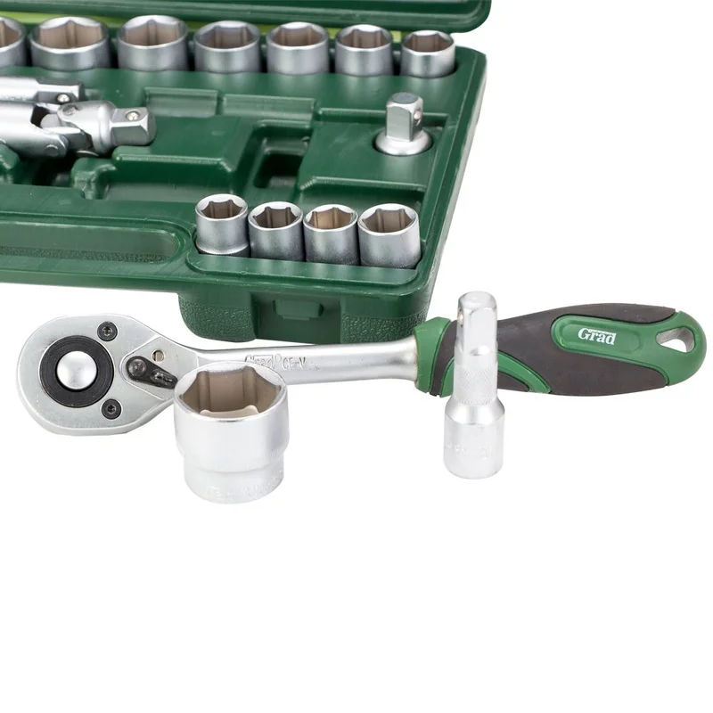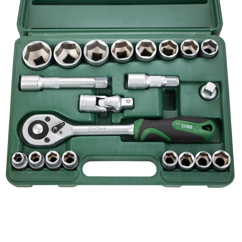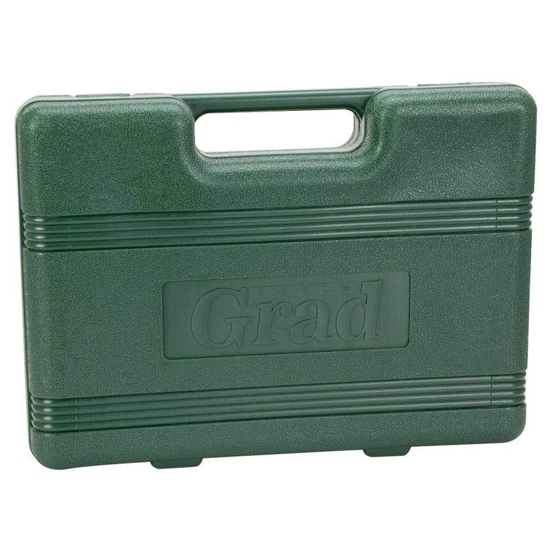 Набори GRAD - лінійка для побутового використання. Набори підходять як для виконання нескладного автомобільного ремонту, так і для побутового застосування. Інструменти виготовлені з міцної інструментальної сталі і мають тришарове покриття (Nickel X2 + Chrome). Для комфортного зберігання та транспортування, набори поставляються в кейсі, який виготовлений з міцного АБС-пластику з металевими замками.