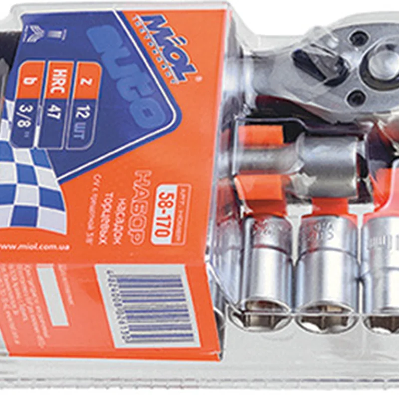 Набір насадок торцевих з тріскачками (72 рубці, реверс) застосовується для професійної роботи з різьбовими з'єднаннями. Хром-ванадій. 58-140 (головки 10-24 мм; подовжувач 125 мм) 58-145 (головки 10-24 мм; подовжувач 150 мм) 58-148 (головки 8-32 мм; подовжувач 125 мм) 58-152 (головки 4-13 мм; подовжувач 100 мм) 58-155 (головки 4-14 мм; подовжувач 100 мм) 58-157 (головки 4-14 мм; біти TX, PH, FD, HEX; под. 100 мм) 58-170 (головки 10-24 мм; подовжувач 150 мм)
