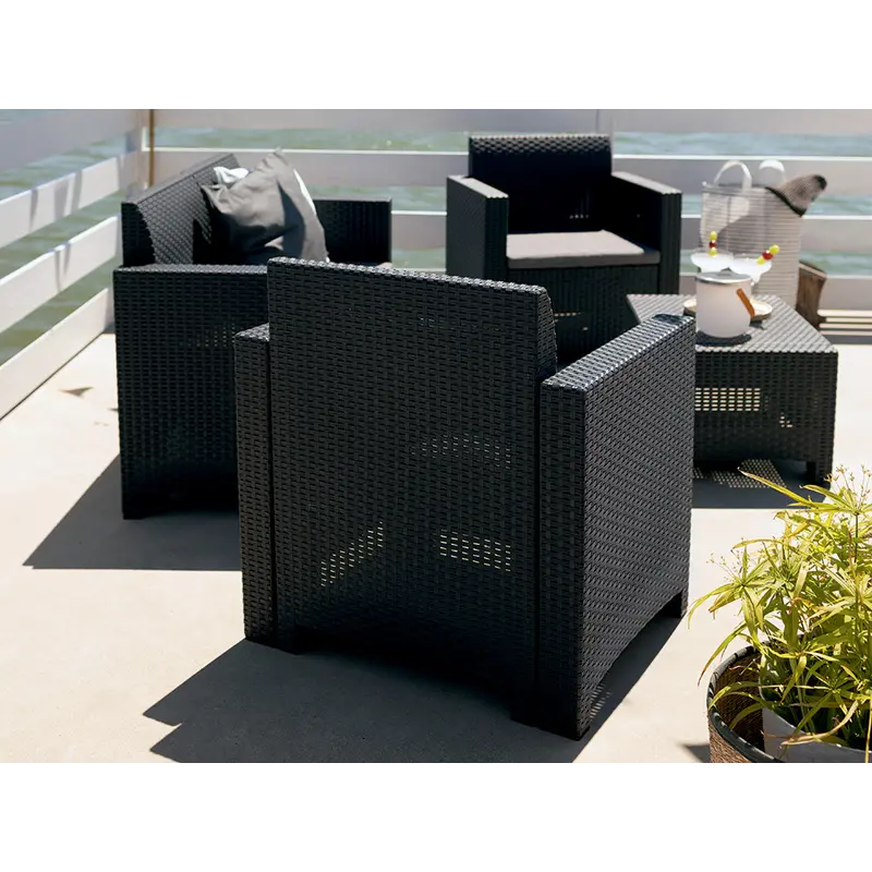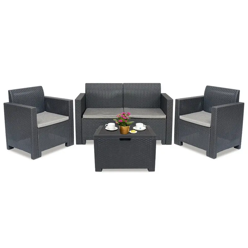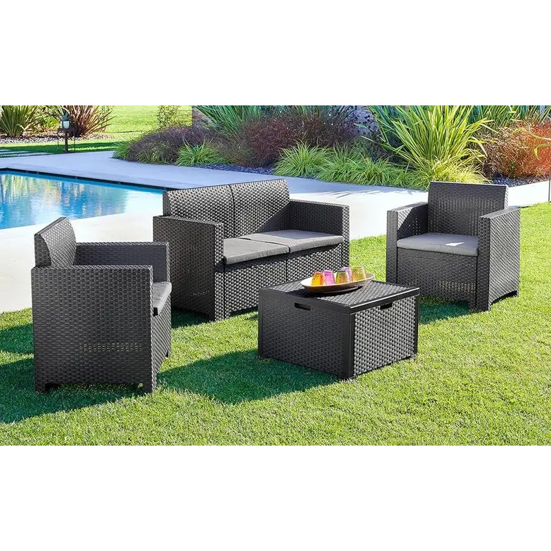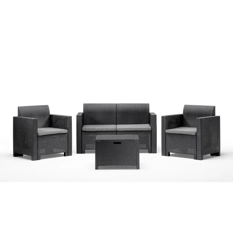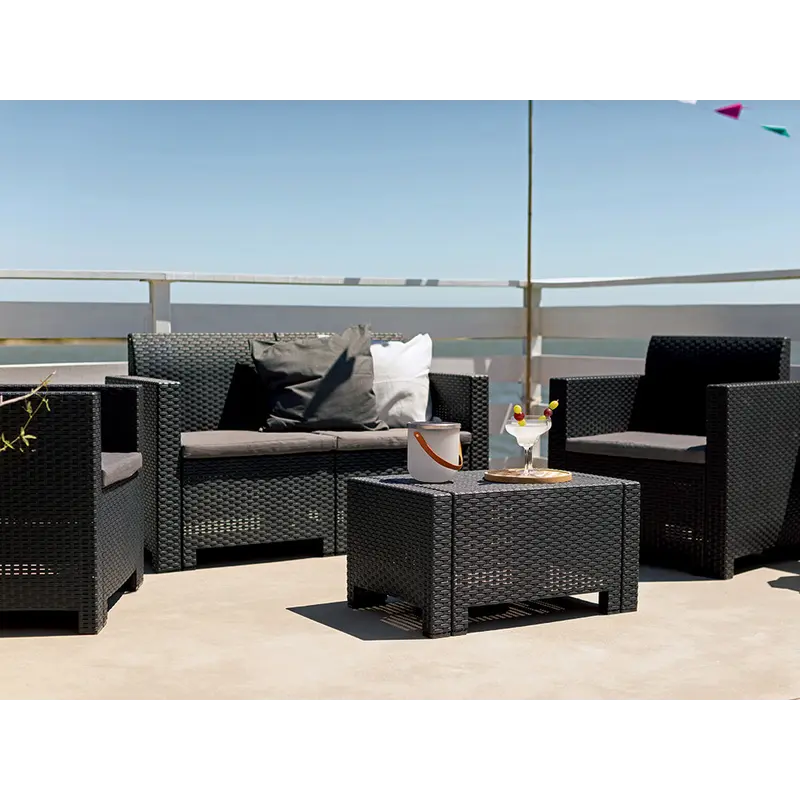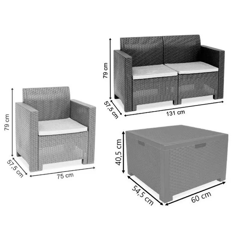 Чотиримісний Набір садових меблів BICA Nebraska 2 у стильному кольорі* графіт призначений для будь-якого використання — в приміщенні та на вулиці, приватного чи професійного. Чудово підійде для облаштування відкритого простору — саду, тераси, зони барбекю, веранди, заходів на свіжому повітрі, балконної зони та багато іншого. До складу набору входять 2 комфортні крісла, двомісний диван, 4 подушки та стіл-скриня.