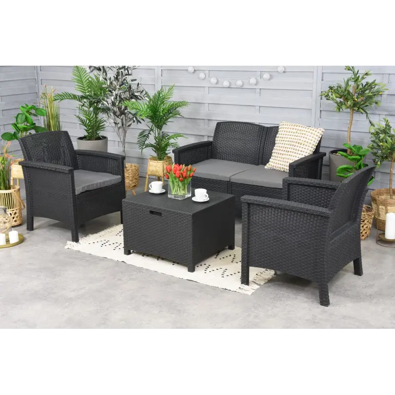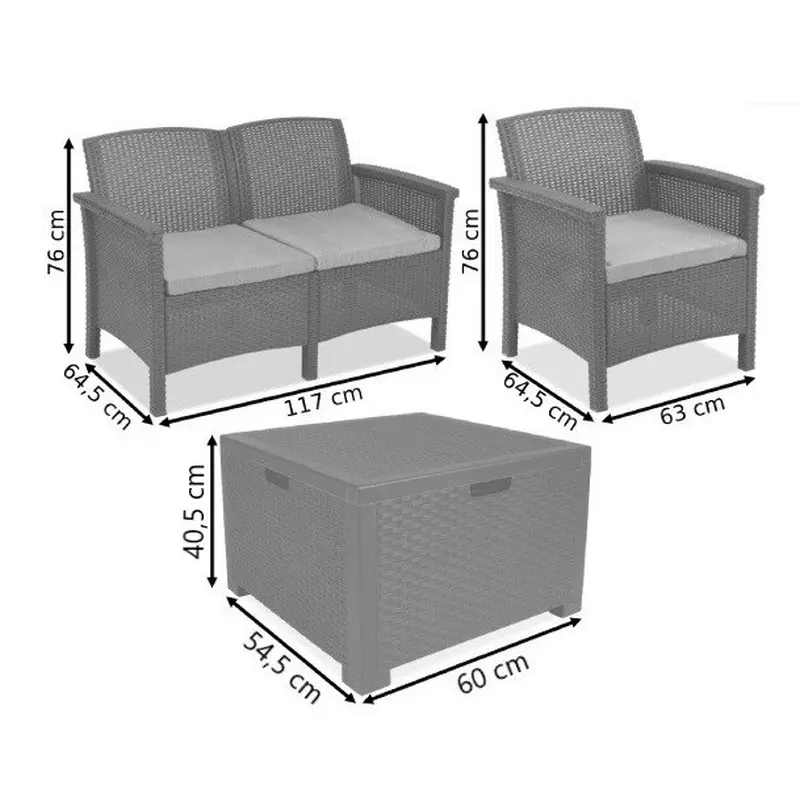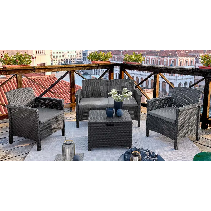 Чотиримісний Набір садових меблів BICA Venezia 2 у стильному кольорі графіт призначений для будь-якого використання — в приміщенні та на вулиці, приватного чи професійного. Чудово підійде для облаштування будь-якого відкритого простору — саду, тераси, зони барбекю, веранди, заходів на свіжому повітрі, балконної зони та багато іншого. До складу набору входять 2 комфортні крісла, двомісний диван, 4 подушки та стіл-скриня.