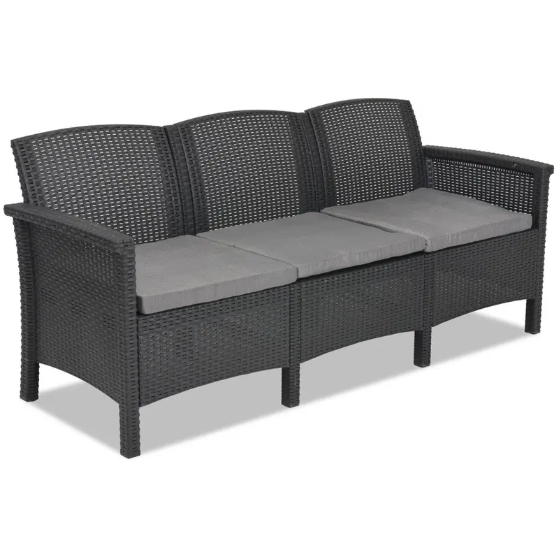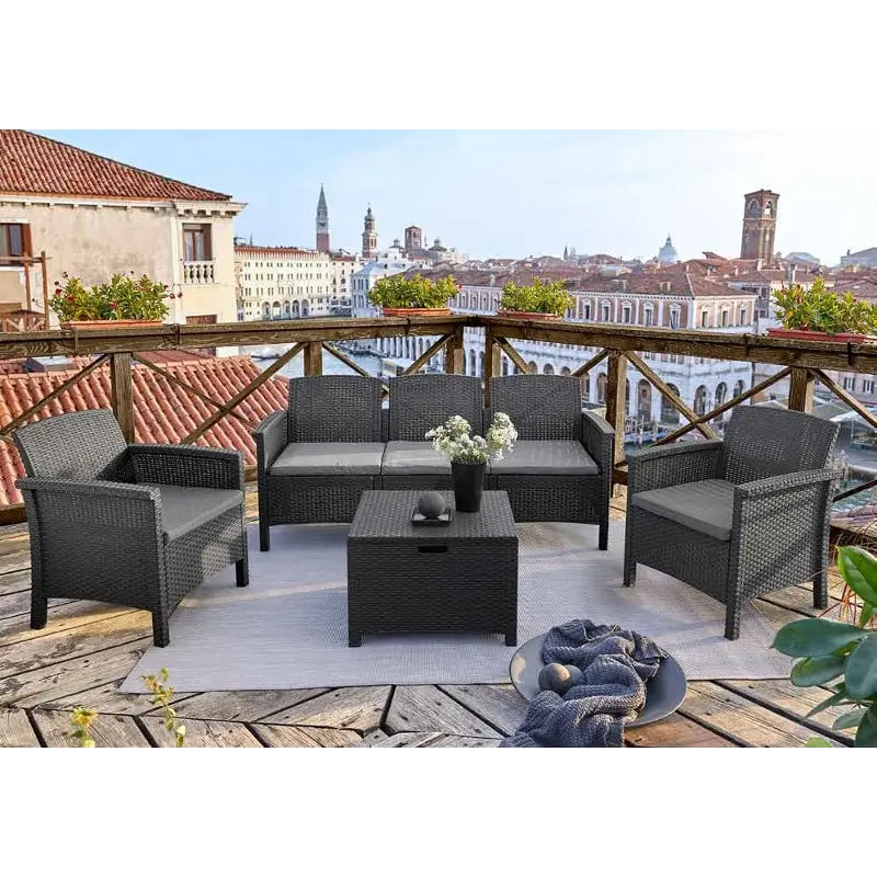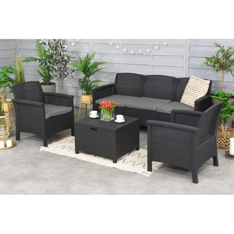 П'ятимісний Набір садових меблів BICA Venezia 3 у стильному кольорі графіт призначений для будь-якого використання — в приміщенні та на вулиці, приватного чи професійного. Чудово підійде для облаштування будь-якого відкритого простору — саду, тераси, зони барбекю, веранди, заходів на свіжому повітрі, балконної зони та багато іншого. До складу набору входять 2 комфортні крісла, тримісний диван, 5 подушок та стіл-скриня.