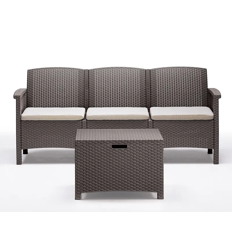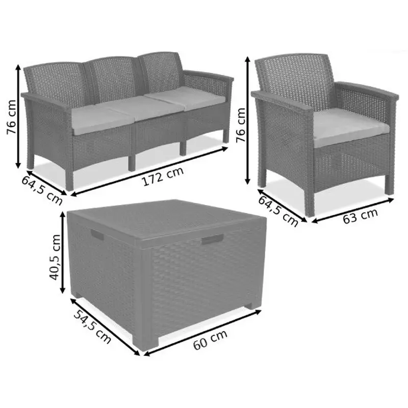 П'ятимісний Набір садових меблів BICA Venezia 3 у приємному сіро-бежевому кольорі призначений для будь-якого використання — в приміщенні та на вулиці, приватного чи професійного. Чудово підійде для облаштування будь-якого відкритого простору — саду, тераси, зони барбекю, веранди, заходів на свіжому повітрі, балконної зони та багато іншого. До складу набору входять 2 комфортні крісла, тримісний диван, 5 подушок та стіл-скриня.