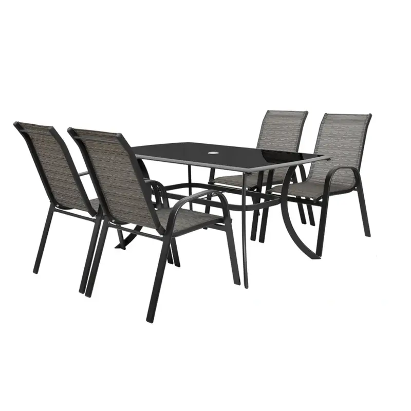 Алюмінієвий набір з чотирьох стільців (штабельний) з покриттям comaxit. Стіл із сталевого та алюмінієвого профілів, стільниця із загартованого чорного скла. Підходить як для зовнішнього, так і для внутрішнього використання.