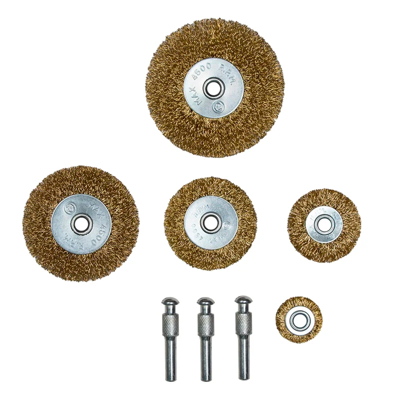 Набір щіток дротяних 5шт Ø25; 38; 50; 65; 75мм хвостовик Ø6мм (латунірованная) SIGMA (9010021) призначений для зачистки поверхонь від лакофарбових покриттів, іржі, окалини, різних забруднень, зачистки зварних швів.