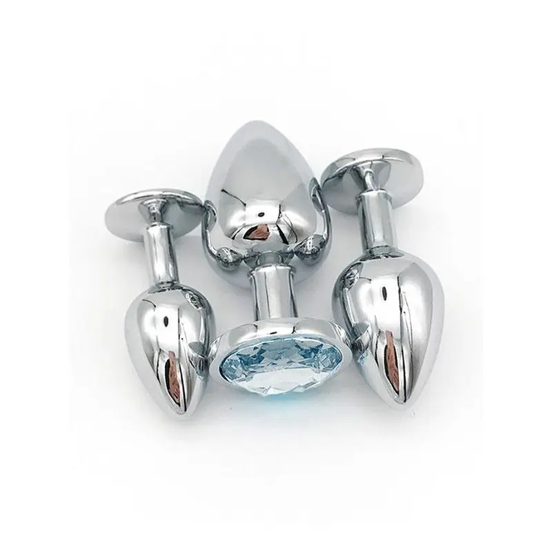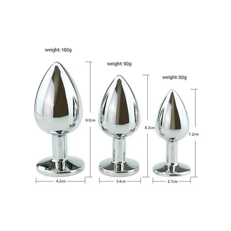 Набір трьох металевих анальних пробок різного розміру з кольоровими кристалами.Розмір і вага:- маленька (S) діаметр - 2,8 см. (окружність - 8,48 см.), висота - 7,2 см, вага: 50 грам;- середня (M) діаметр - 3,4 см. (окружність - 10,68 см.), висота - 8,3 см., вага: 90 грам;- велика (L) діаметр - 4,2 см. (окружність - 13,19 см.), висота - 9,0 см, вага: 160 грам.Матеріал: метал, скло.