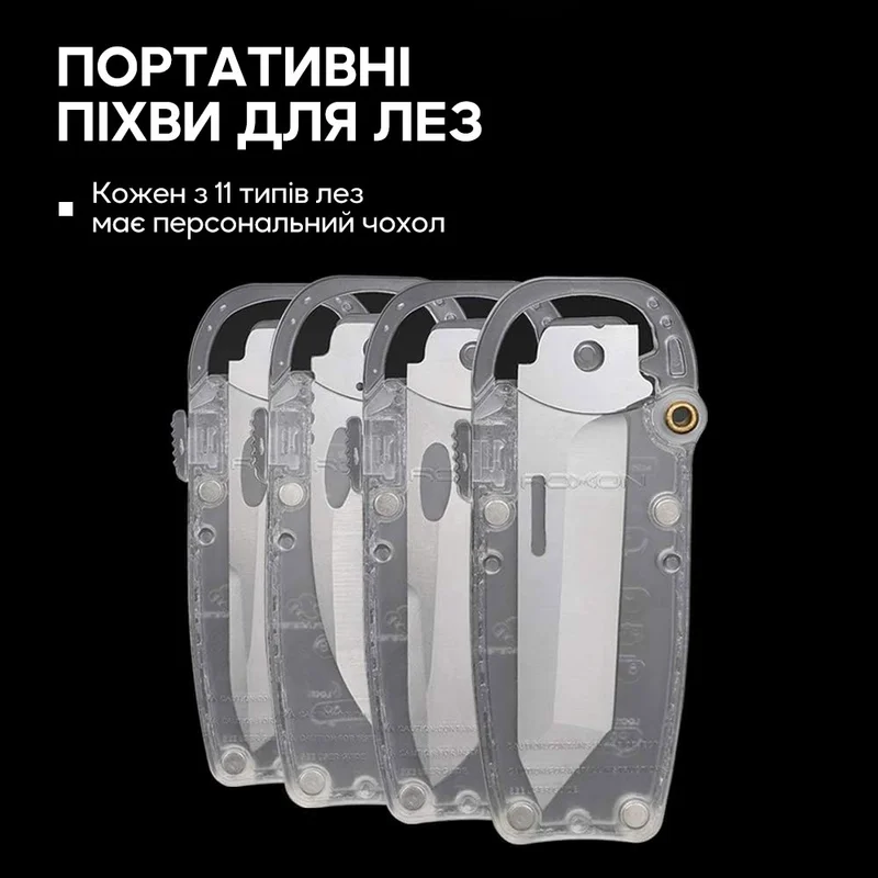 Під кожну задачу потрібен окремий тип клинка, тому бренд Roxon випускає функціональний набір зі змінними лезами, які розширюють можливості інструменту. Аксесуари з цього комплекту сумісні з трьома інструментами фірмового виробництва: кишеньковим мультитулом S802 Phantom і ножами зі складаною конструкцією S502 Phantasy та S502U.