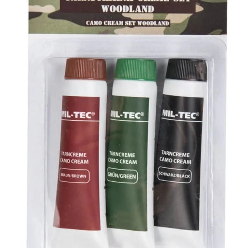 Набор из трех маскировочных красок в тубах для окраски лица и других открытых частей тела. Каждая краска помещена в тубу объемом 30 мл, их состав нетоксичен, они также устойчивы к воде и поту. В набор входит зеленый, черный и коричневый.