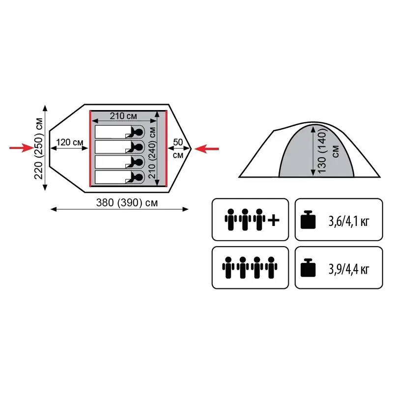 - Внутрішній намет: 100% дихаючий поліестер