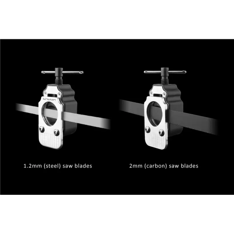 Threadless Saw Guide совместим с трубами диаметром от 1 до 1¼ дюйма и оснащен двухсторонней панелью для размещения пилок двух типов: стальных толщиной 1,2 мм и карбоновых толщиной 2 мм.