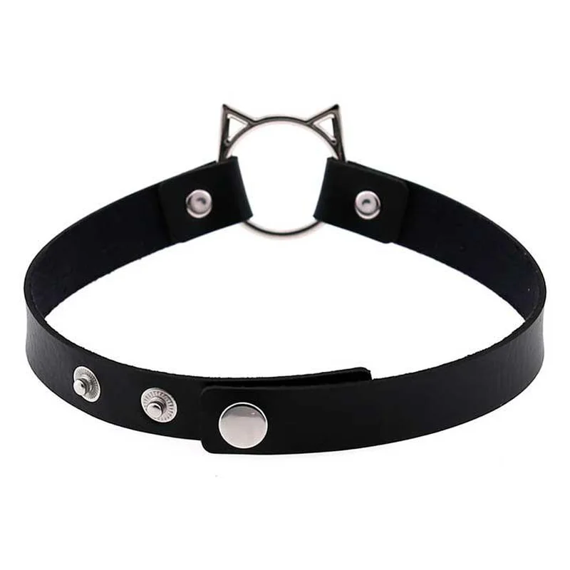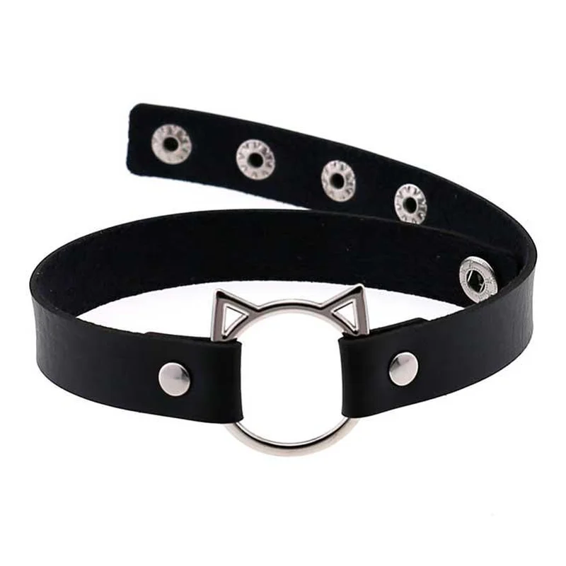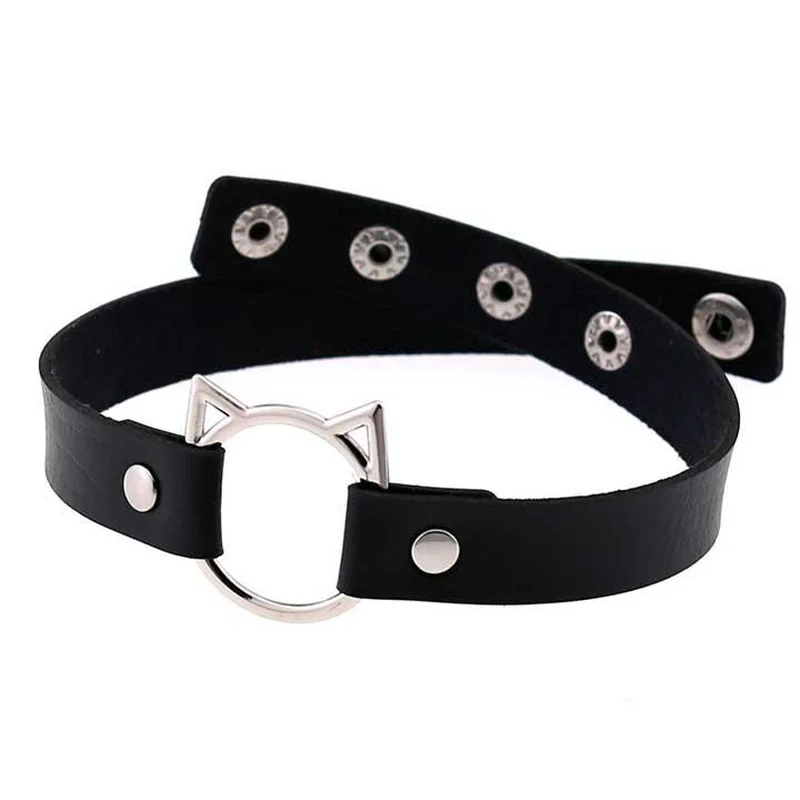 Шкіряний нашийник на шию з металевим кільцем і котячими вушкамиМожна носити як самостійний аксесуар так і з повідцем.Розмір: довжина 44 см, ширина 1,8 см, діапазон регулювання 35 ~ 42 смМатеріал: екошкіра, метал.Колір: Чорний