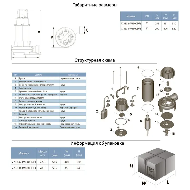 - Корпус насоса: чавун / нержавіюча сталь AISI 304