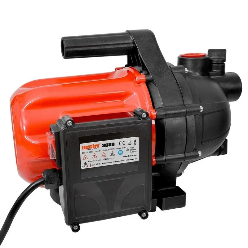 HECHT 3080 - це поверхневий садовий насос з викидом до 38 м і глибиною всмоктування 8 м. За ідеальних умов насос здатний перекачувати до 3200 літрів води на годину. Потужність електродвигуна насоса 800 Вт, живиться від звичайної мережі 230В/50Гц. Максимальний тиск 3,8 бар. Для належної роботи насоса бажано оснастити всмоктувальну трубу на кінці всмоктувальним кошиком із зворотним клапаном (не входить до складу насоса). Діаметр фланців для всмоктування та нагнітання 1". Максимальна температура води 35°C. Загальна вага насоса 6,7 кг. Насос призначений для перекачування чистої технічної води, наприклад для поливу, відкачування води з басейни, він не призначений для перекачування питної води.