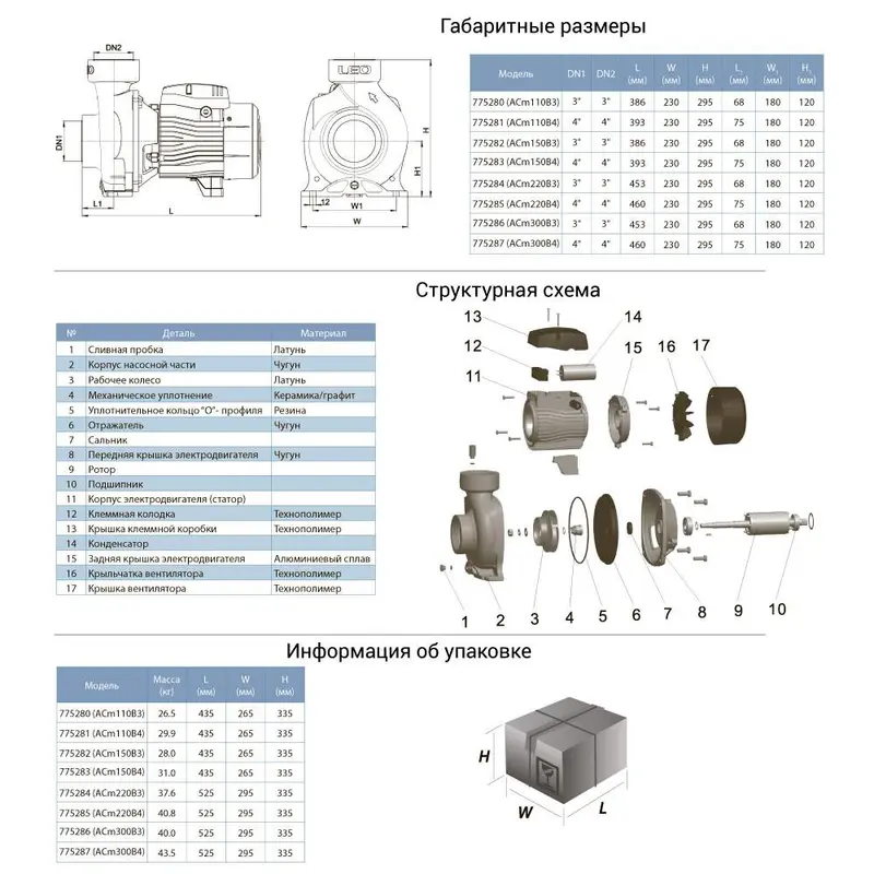 Насос відцентровий 380В 3.0кВт Hmax 20м Qmax 1200л/хв 3" LEO 3.0 AC300B3 (7752863)