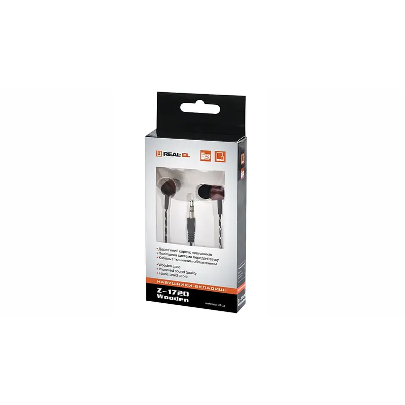 Особливості: Поліпшена система передачі звуку Дерев'яний корпус навушників Кабель з тканинним обплетенням Навушники-вкладиші Real-El Z-1720 призначені для роботи зі звуковими картами ПК та іншими сумісними з ними системами (портативними програвачами, комп'ютерними ігровими приставками тощо).